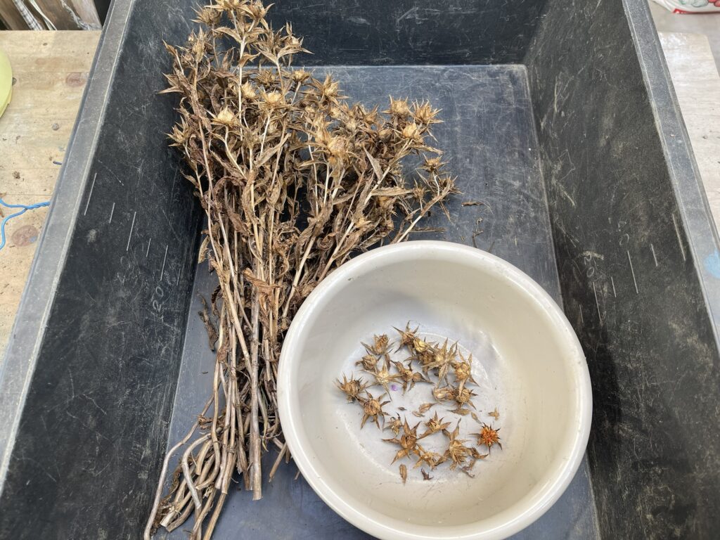 吊るし干ししていた、ベニバナの種を採集しました。今年はさらに増して、ベニバナ染めに挑戦