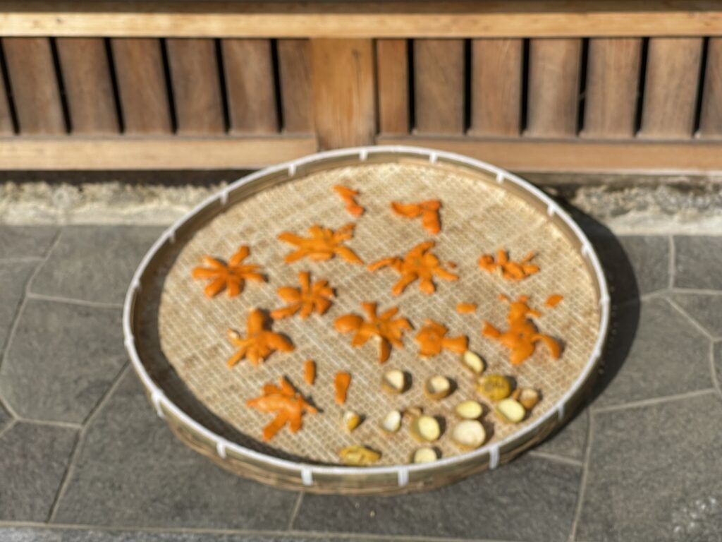 ミカンの皮を天日干しして、陳皮に、タデアイの種も大分乾いてきました