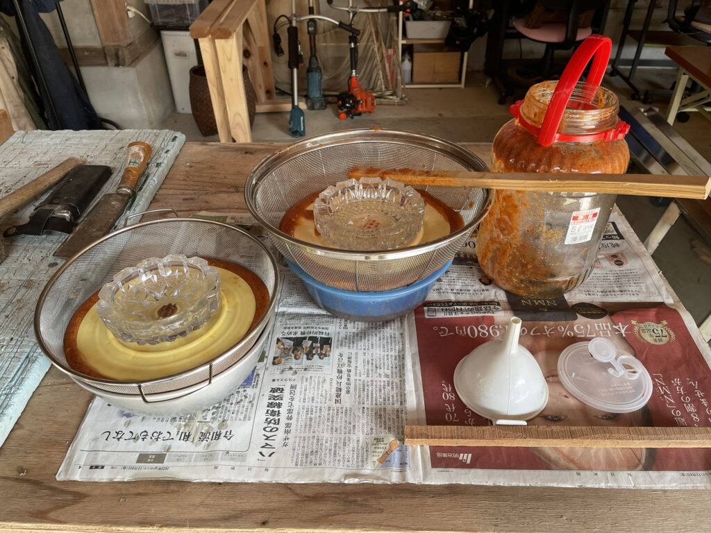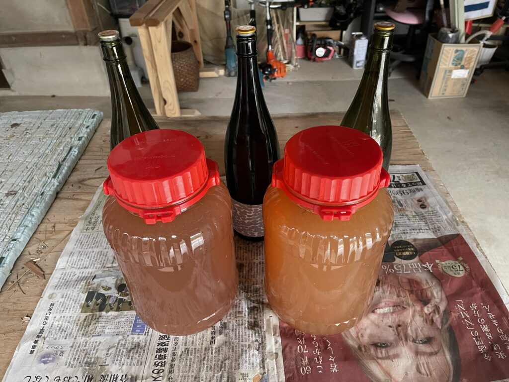 発酵させていた柿酢を絞りました。一升瓶3本、保存瓶2本、大量の柿酢が完成しました。
