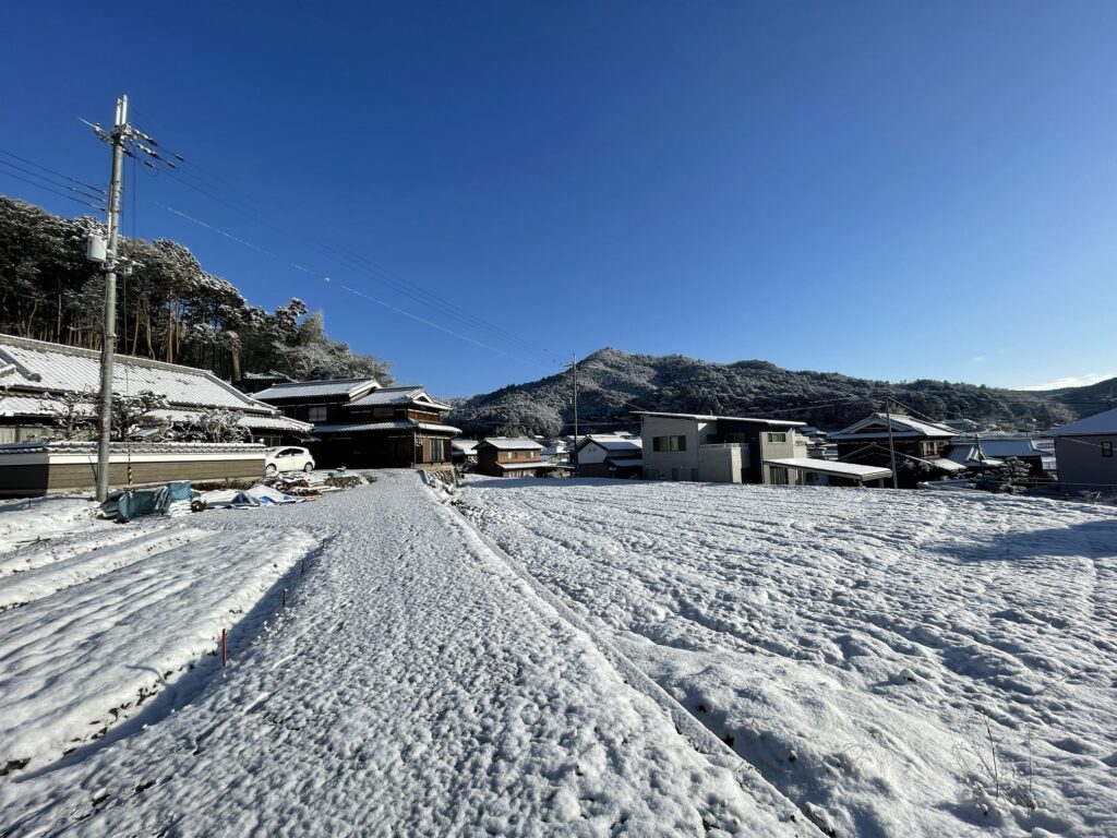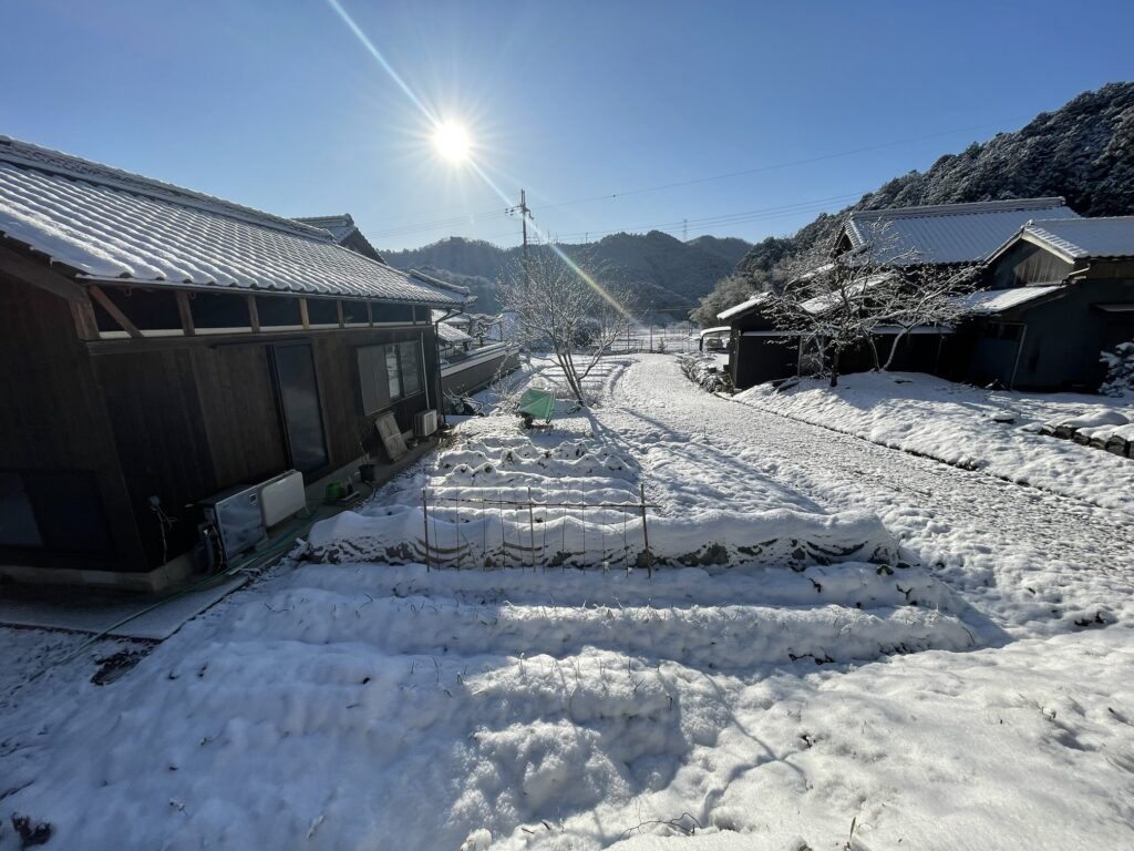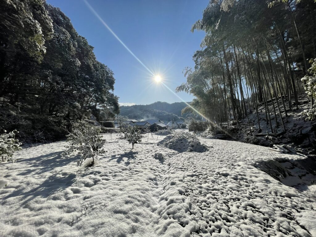 雪の「熊爺の里」深と冷え切った雪明けの朝、快晴の日の出、これもすばらしい里山の風景です。でも作業はしばらくお休みです