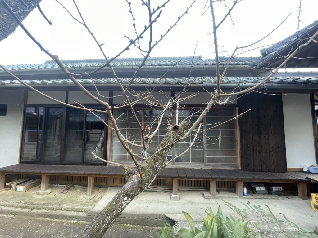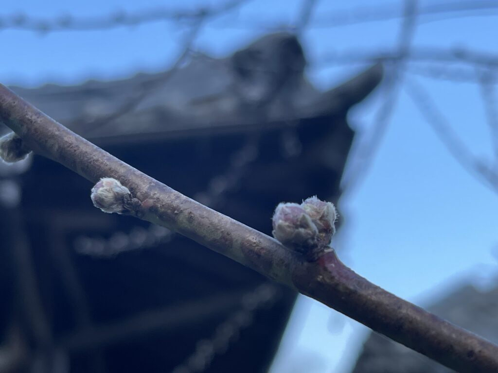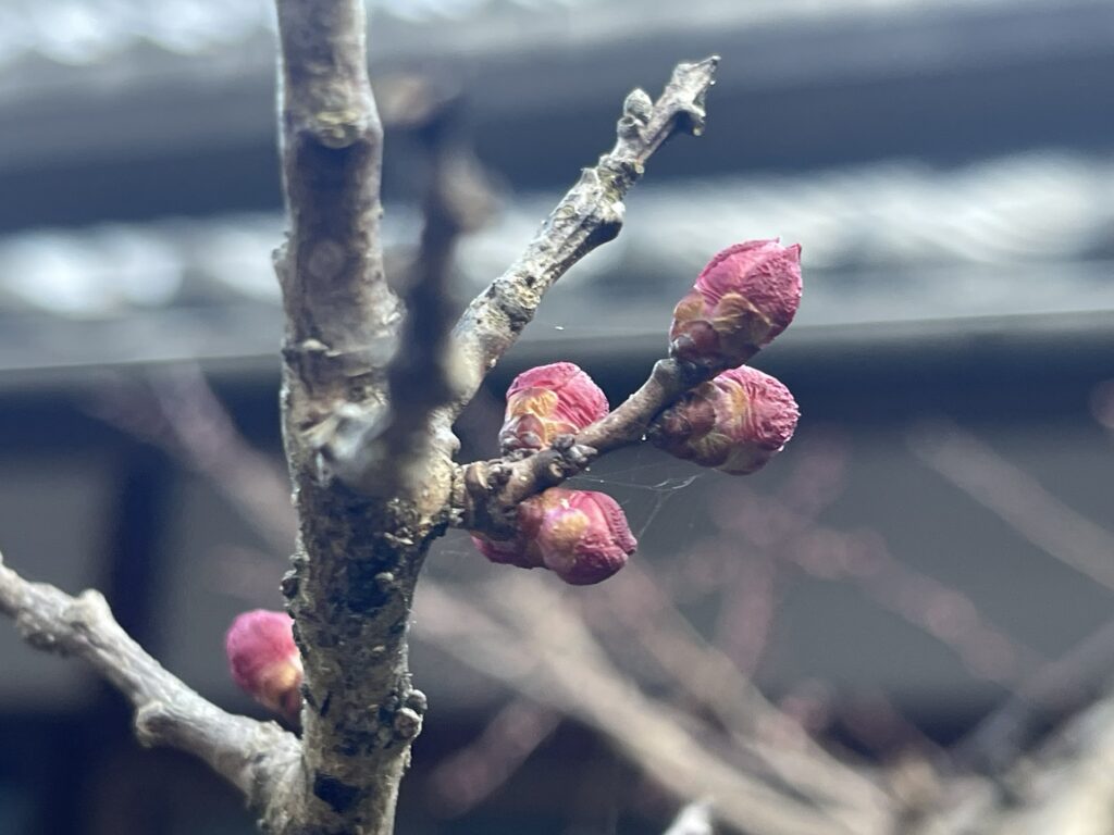 母屋の梅、桃の蕾が膨らみ、春の兆しです