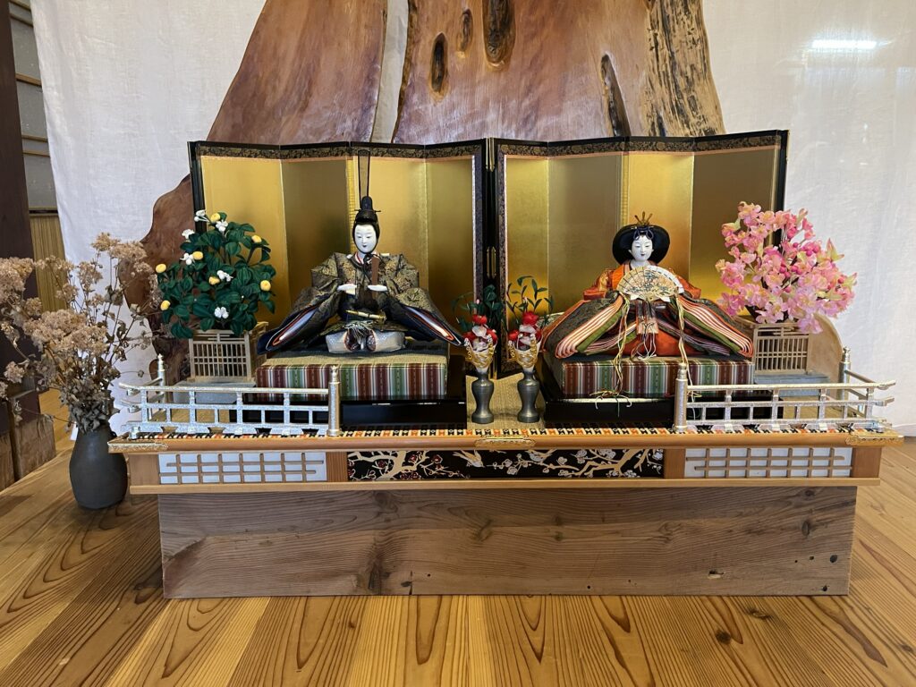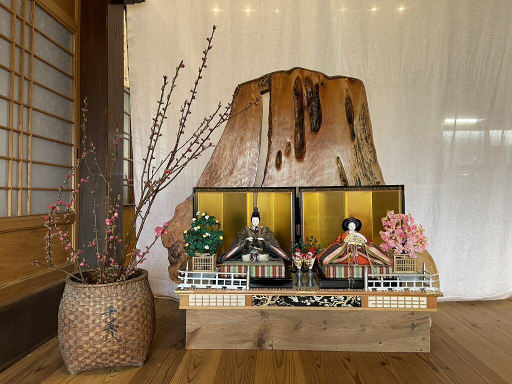 母屋の玄関に、桃と雛人形を飾りました