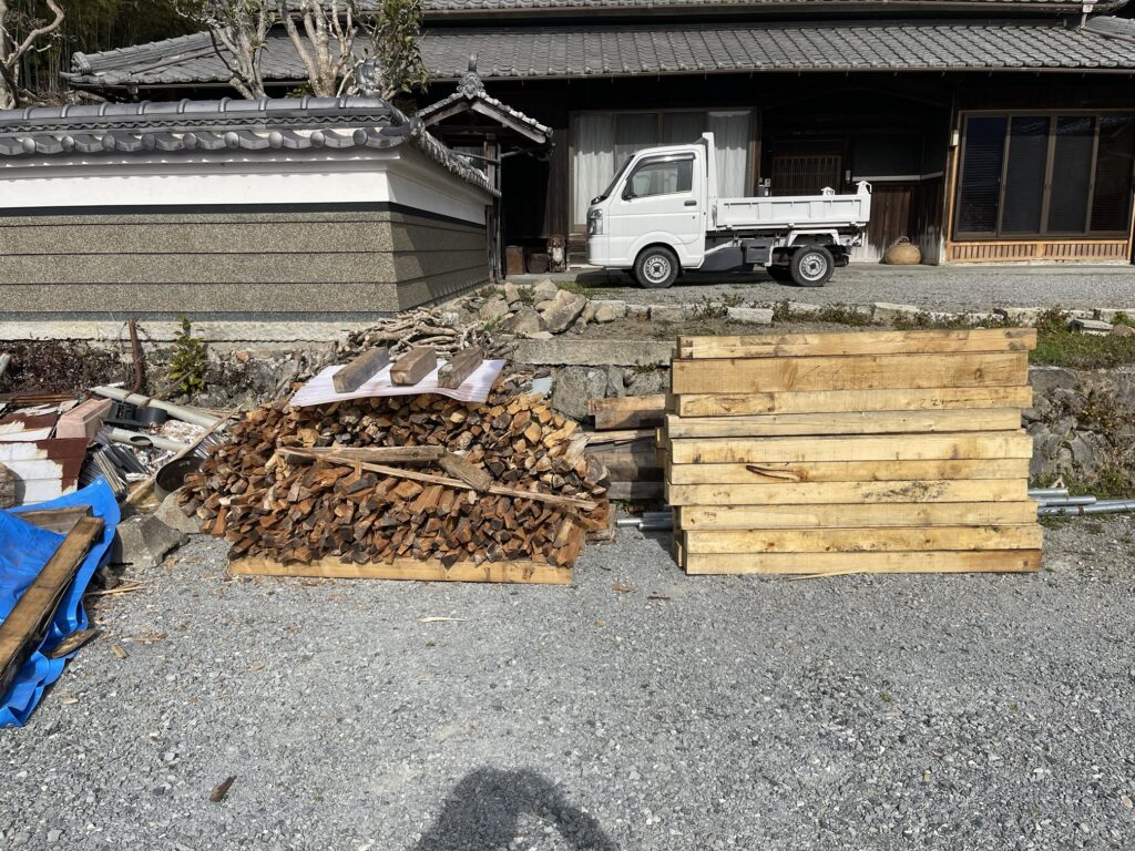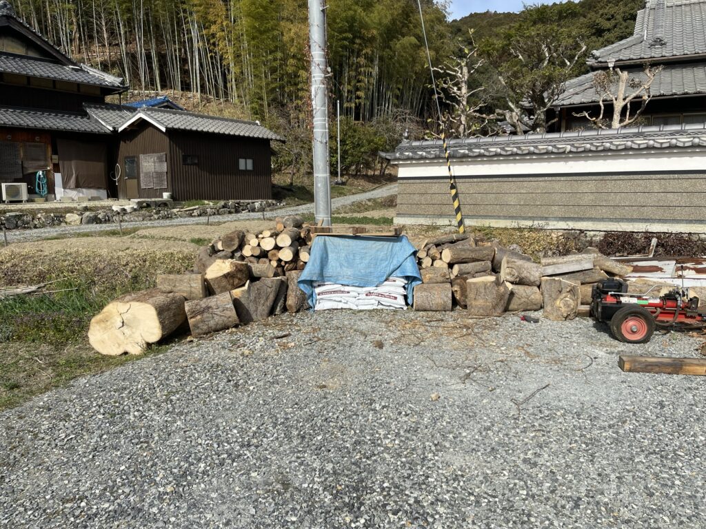 伐採した丸太、廃材、薪の材を大量に頂きました。薪割り頑張ります