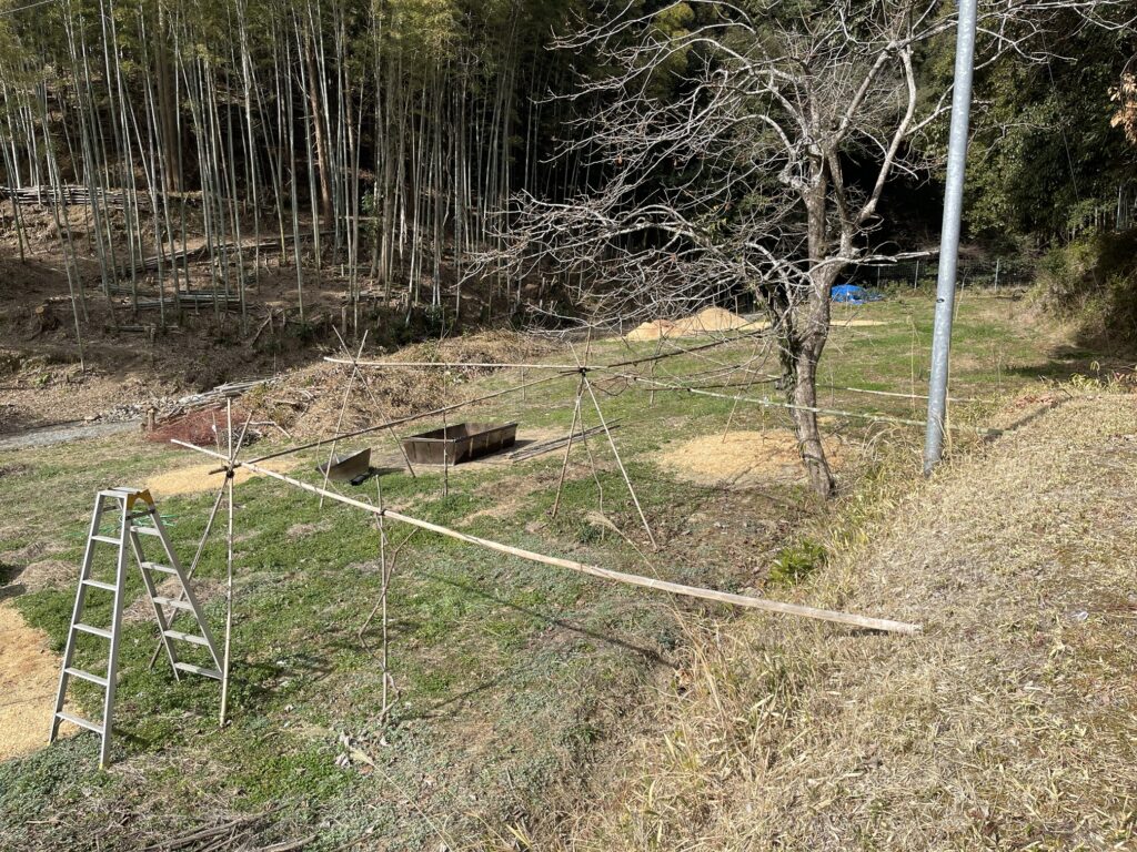 キウイ、ブドウの簡易な棚を設置しました。今年中に本格的な棚を設置予定。イチジクも剪定して支柱設置、今年は本格的に収穫します