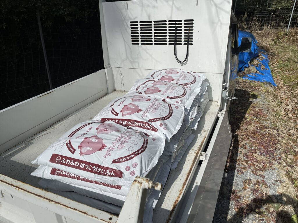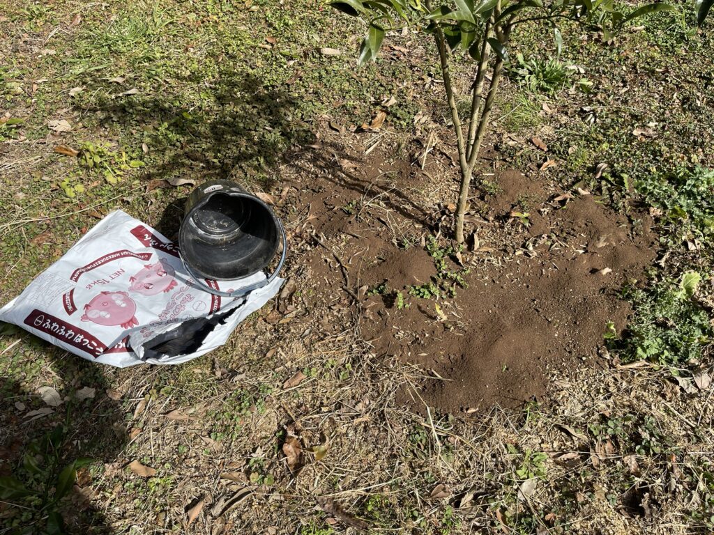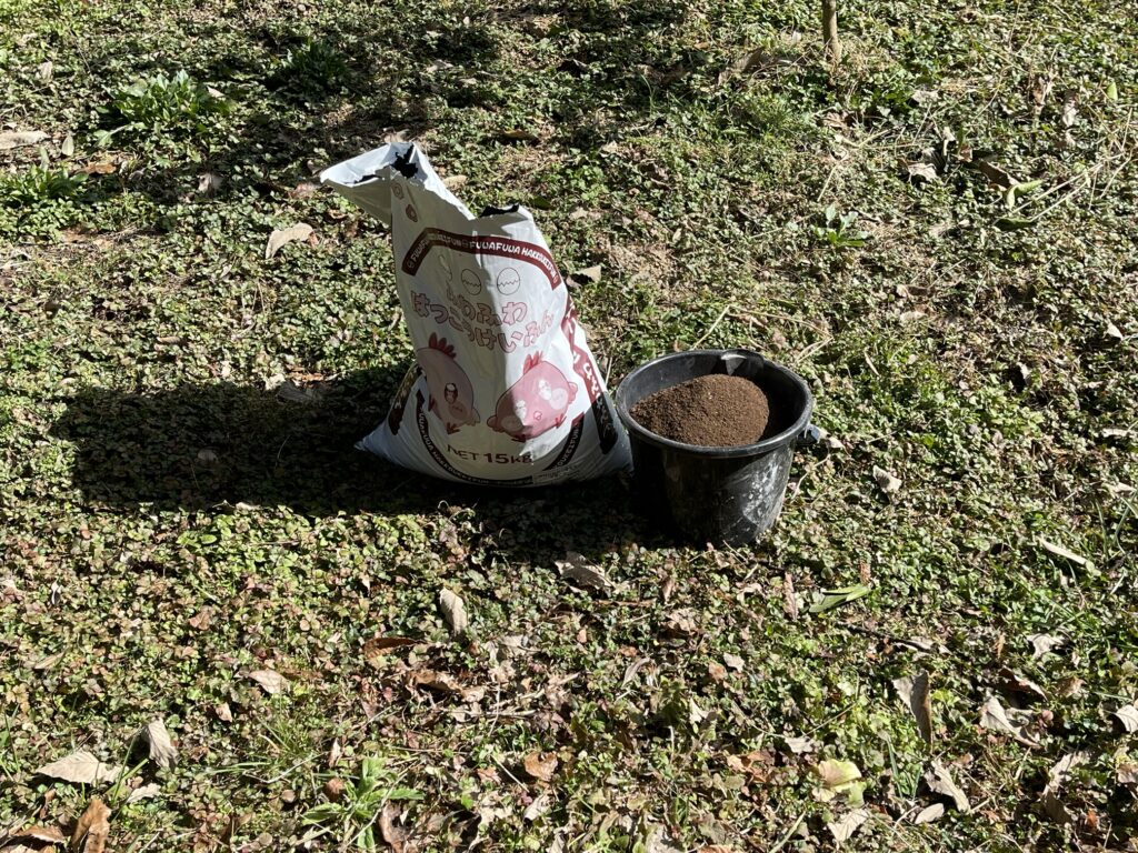 果樹の根元に鶏糞を散布します。1本当たり1/3袋(5kg)使用