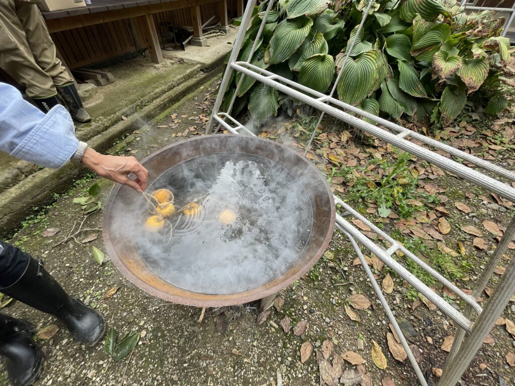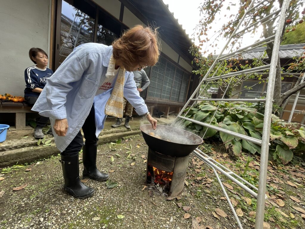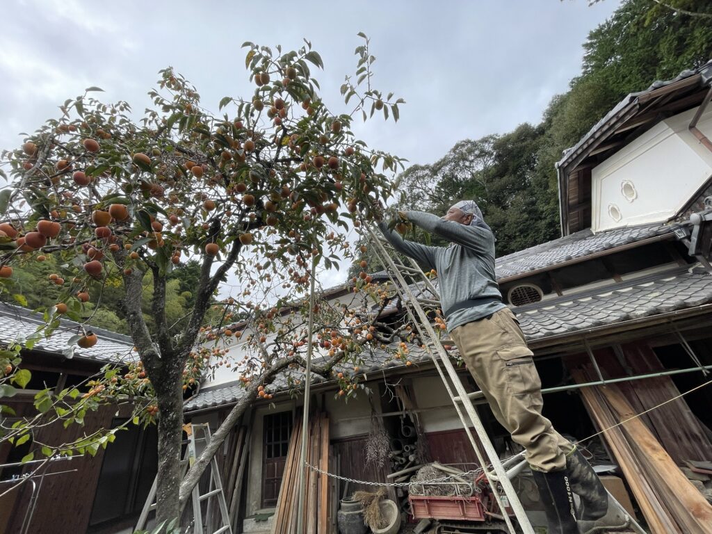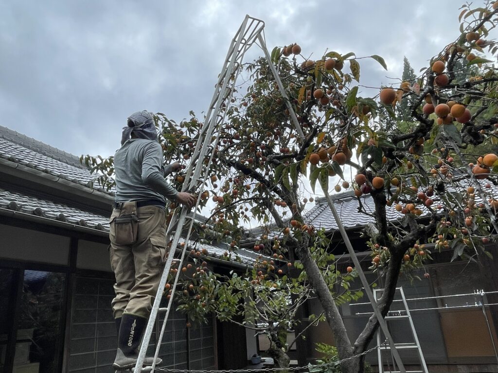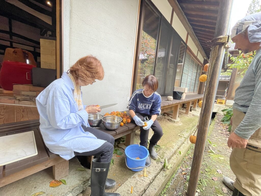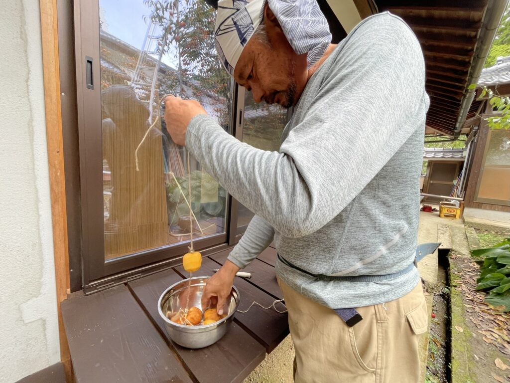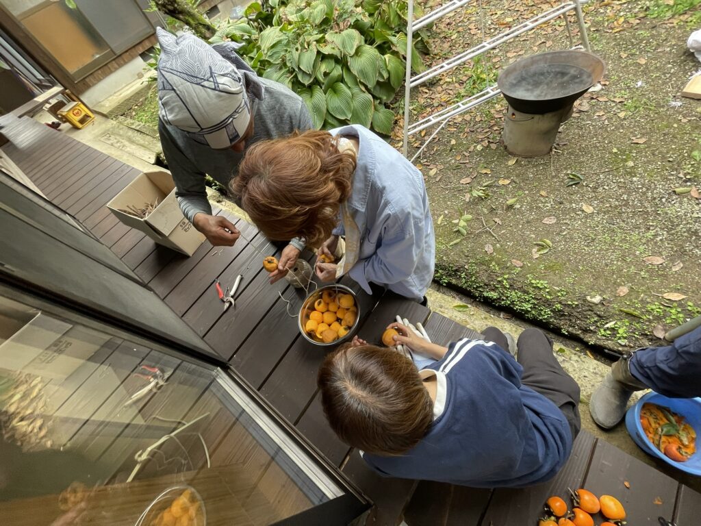 焼き芋を焼いている間に、中庭の柿を収穫、皮を剥いて、ひもで連結して、釜で沸かした熱湯に30秒つけ。、物干しざおにつるして完了