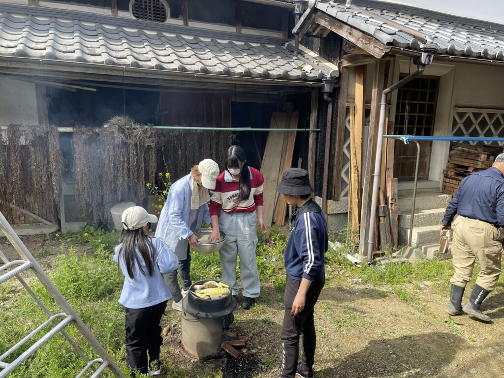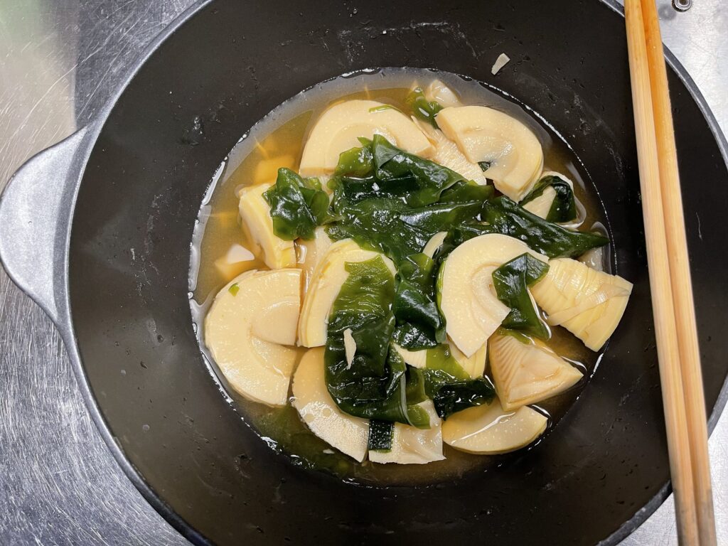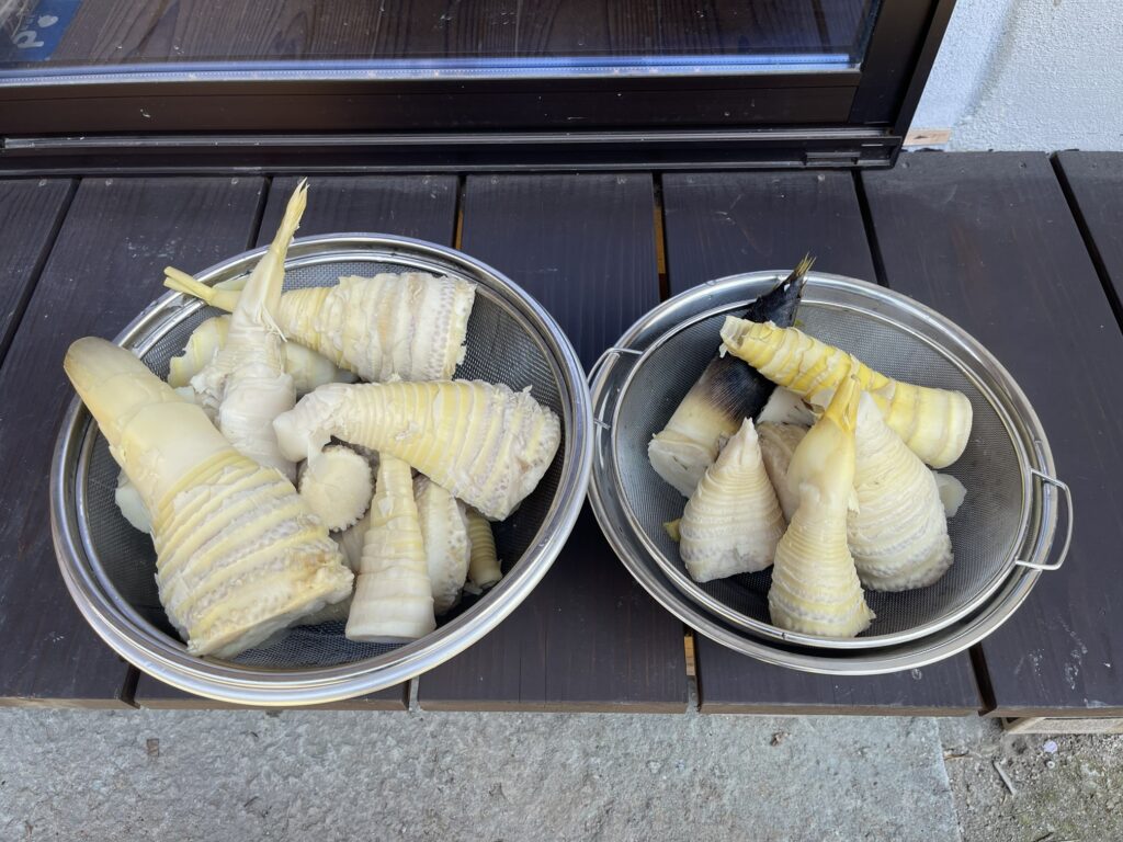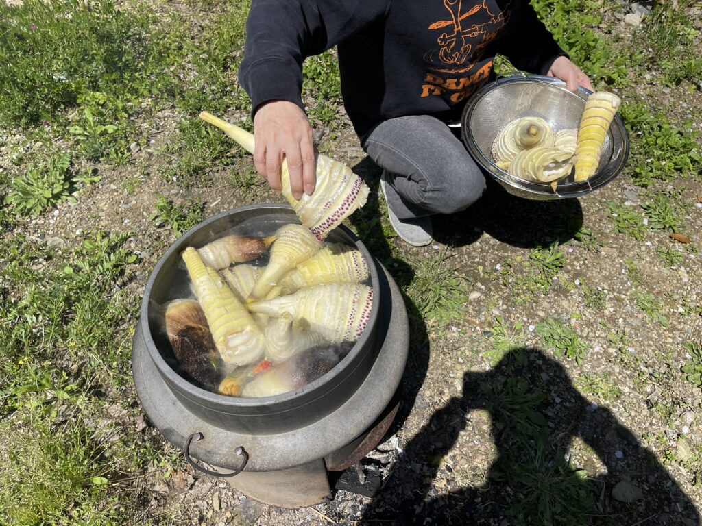 竹林で旬のタケノコを収穫、大鍋であく抜きして、お持ち帰り。