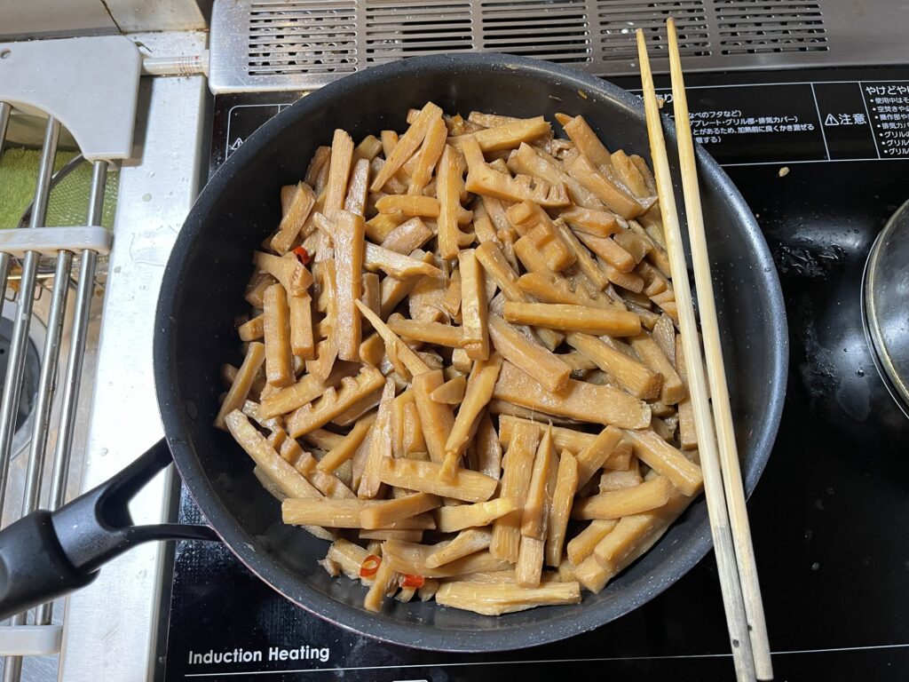米ぬか、鷹の爪、小ぶりのタケノコは皮付きのまま大鍋に投入、あく抜き3点セット、これであく抜きができます