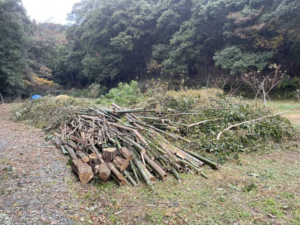 果樹園に集積された竹を、L1500cm程度に切り、モキ製作所製の炭化器で燃やす。