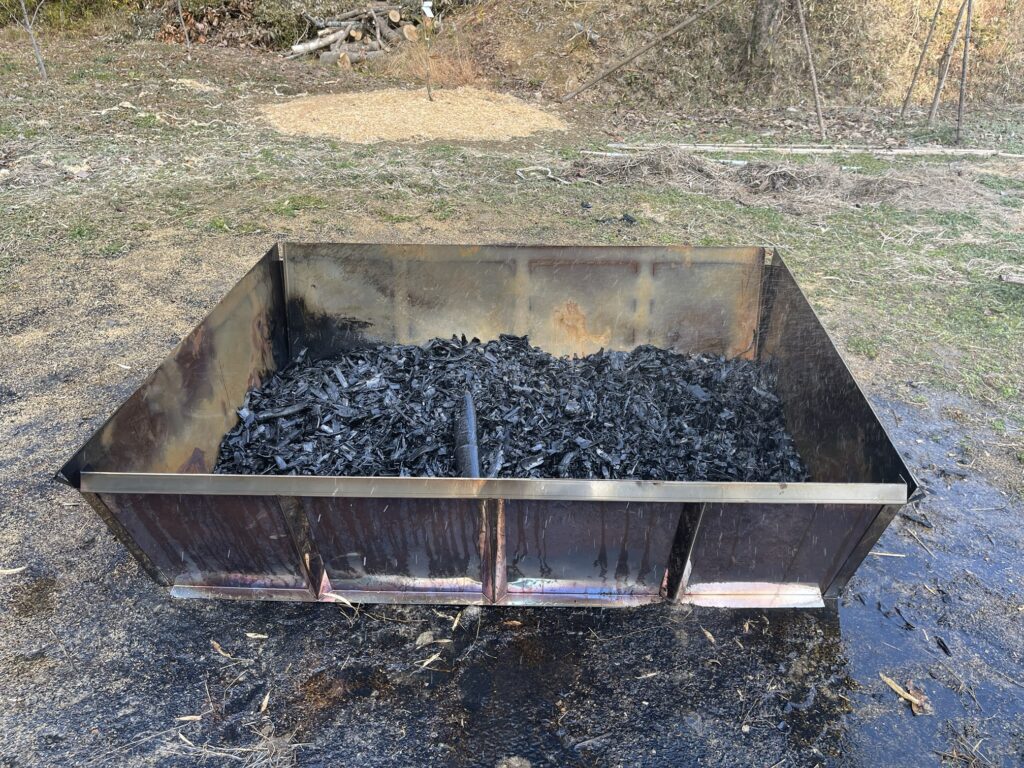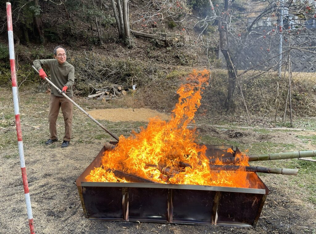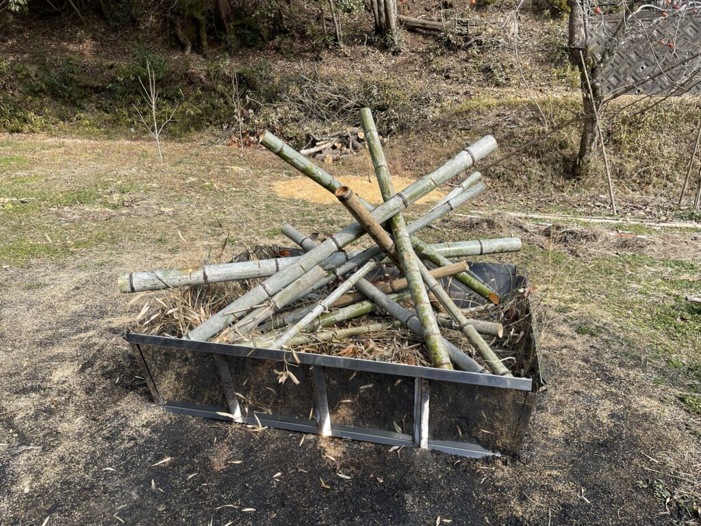 果樹園に集積された竹を、L1500cm程度に切り、モキ製作所製の炭化器で燃やす。
