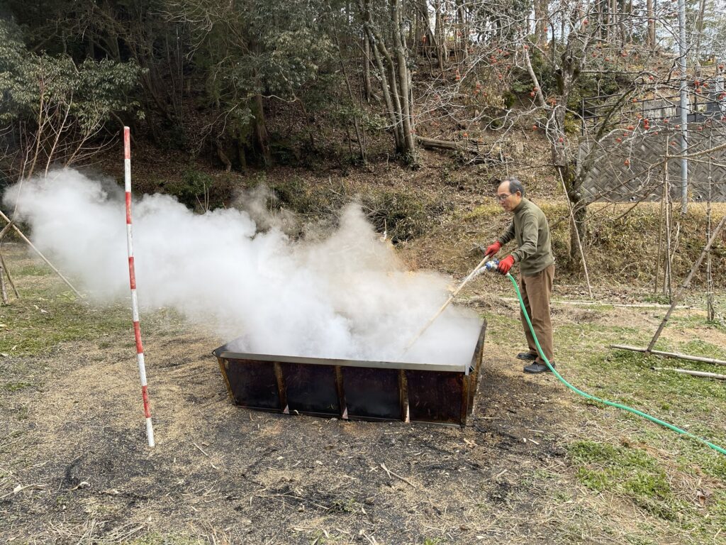 ・熾火になったところでホースで水をかけ、完全に消火する。